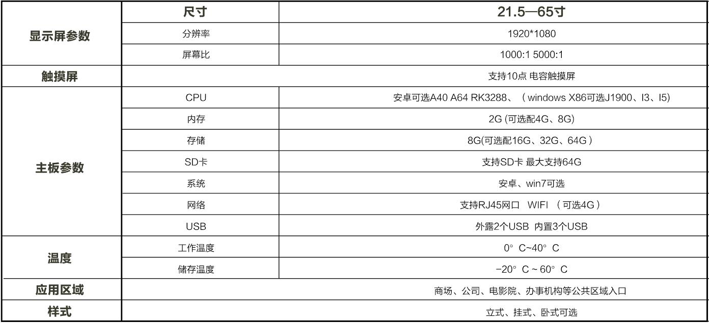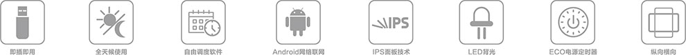 超薄機(jī)身;質(zhì)感拉絲金屬;高清畫質(zhì);觸摸極速反應(yīng);智能分屏;智能遠(yuǎn)程信息發(fā)布;可定時開關(guān)機(jī);提前設(shè)定節(jié)目源;鋼化玻璃屏幕;可定制專屬LOGO、多種顏色、尺寸可選。
